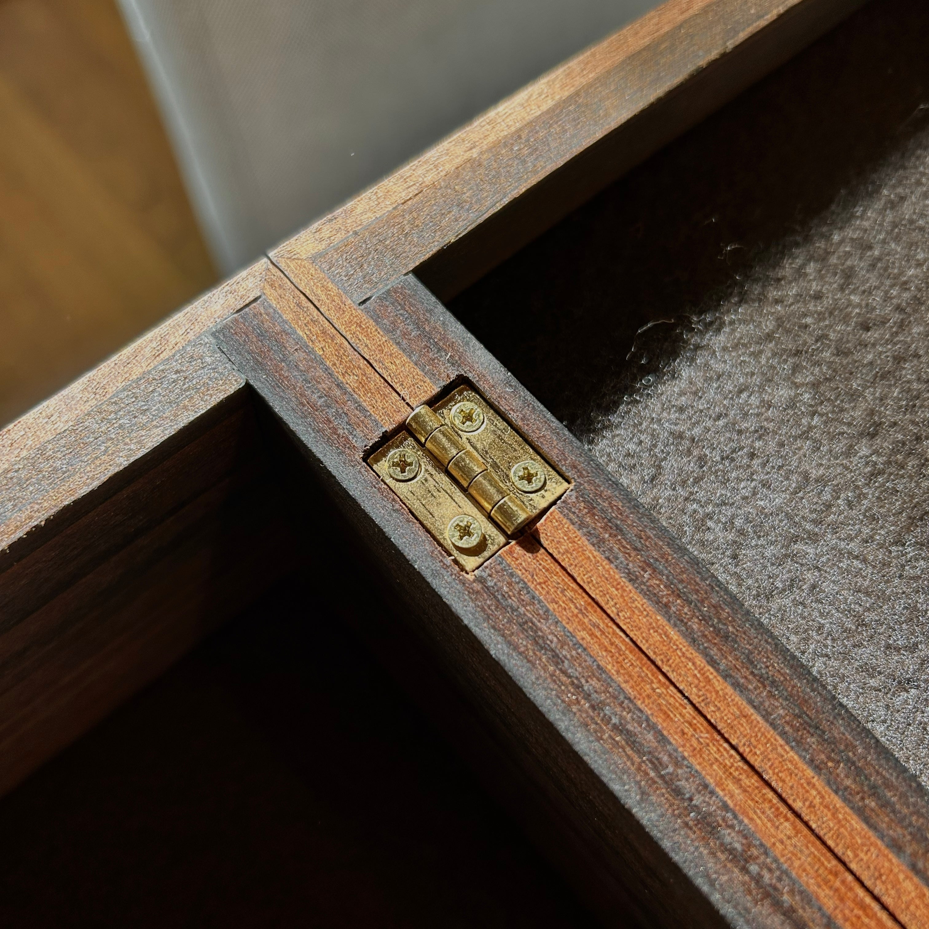 Installing hinges and aligning the lid so it fits perfectly with the lower half of the box can be a delicate process. Before each box is shipped, I check the lid alignment and fine-tune the hinge screws for a precise fit. If the hinges feel slightly loose, that is intentional—tightening them further may cause the lid to shift out of alignment.