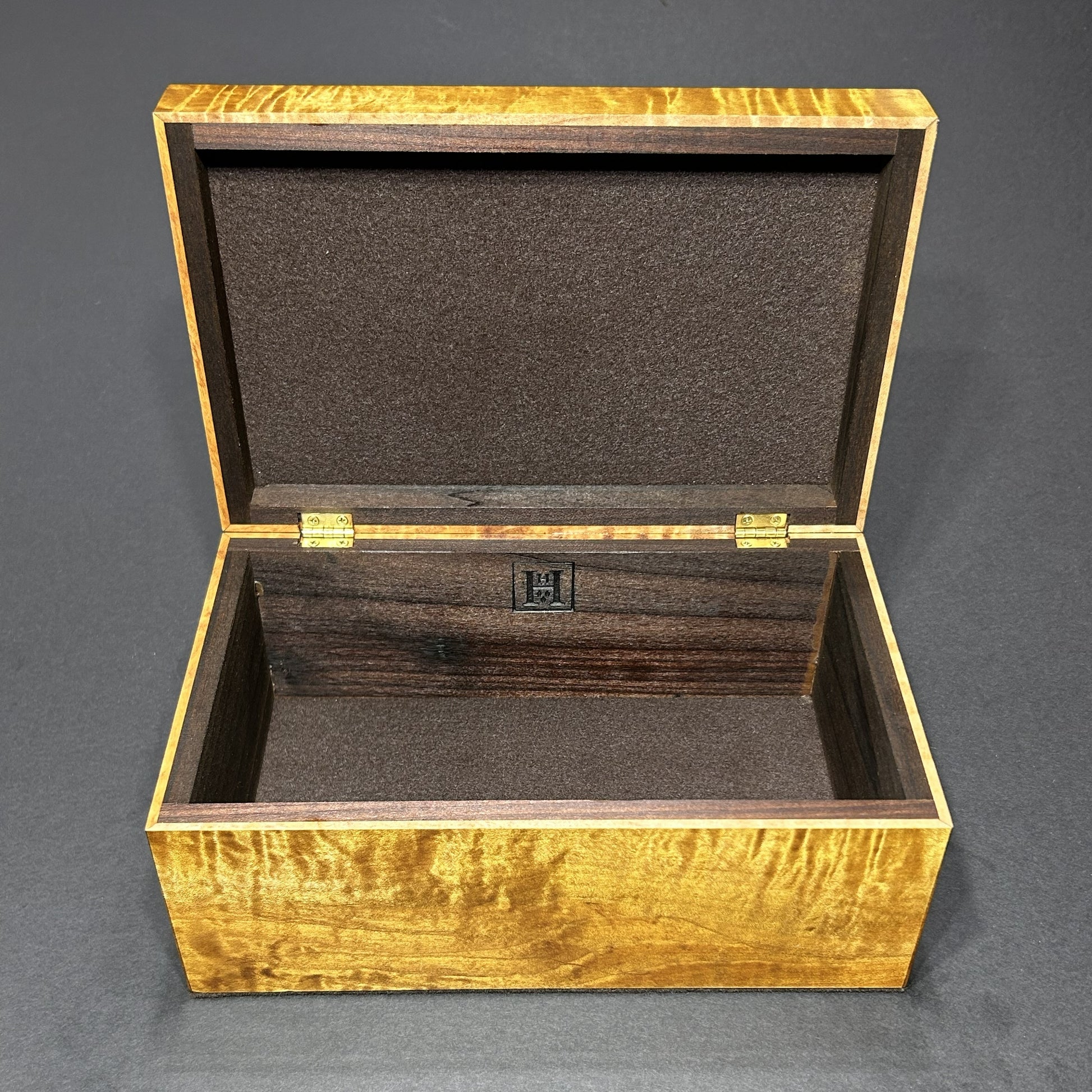 Native to the Pacific Northwest, flamed western maple dazzles with luminous ribbons that shift and glow under changing light. Long favored by violin and guitar makers, it embodies strength, clarity, and natural elegance.