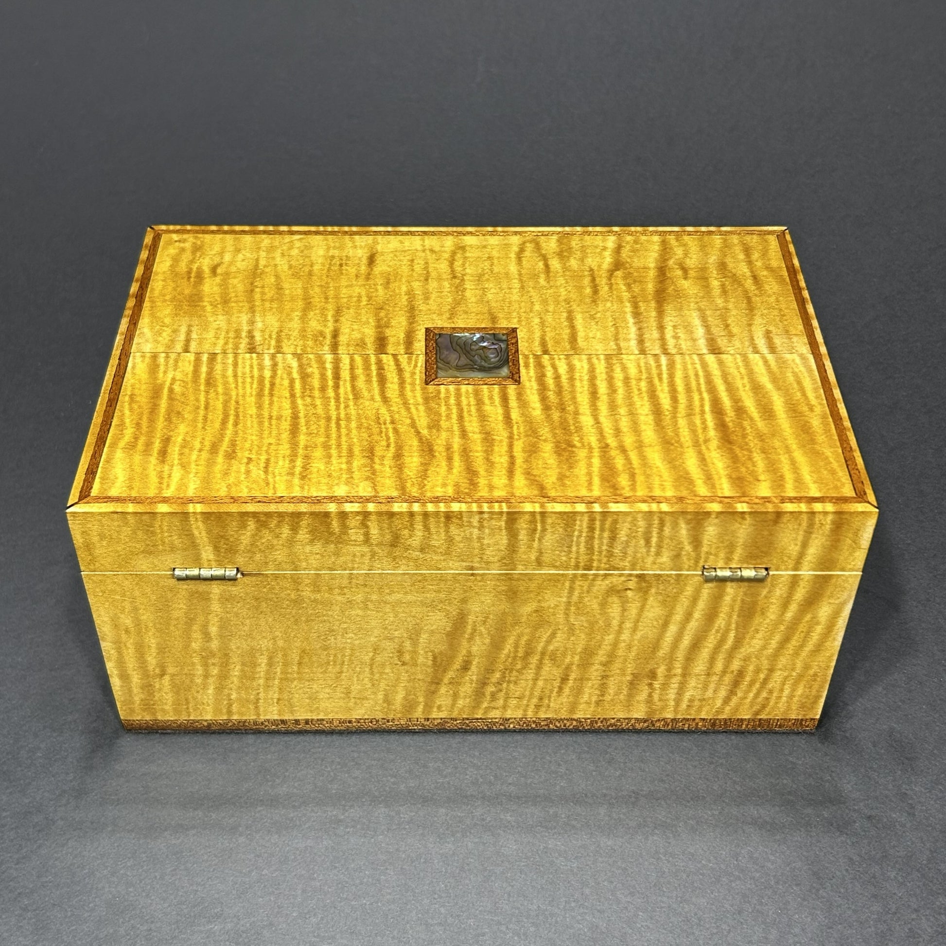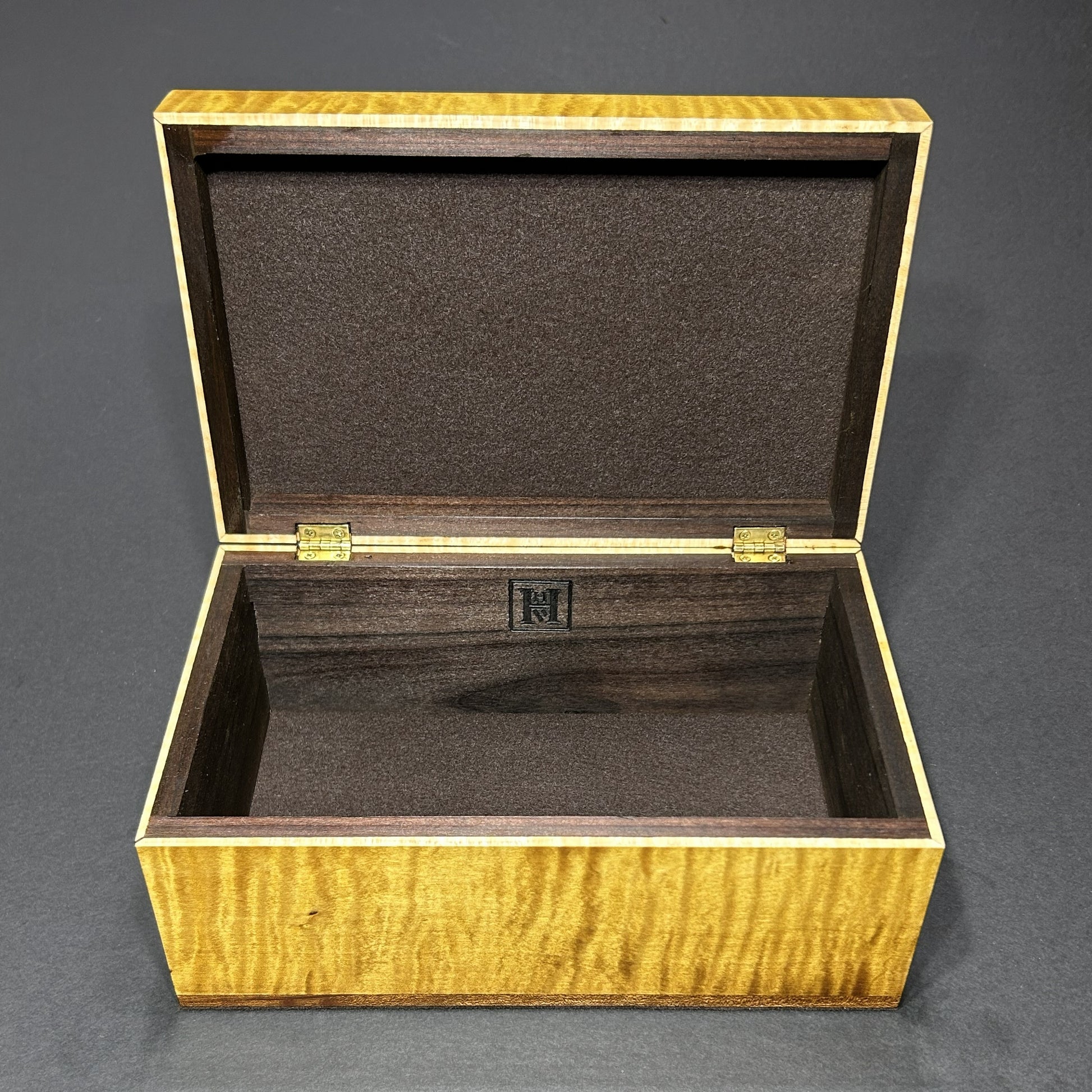 Native to the Pacific Northwest, flamed western maple dazzles with luminous ribbons that shift and glow under changing light. Long favored by violin and guitar makers, it embodies strength, clarity, and natural elegance.
