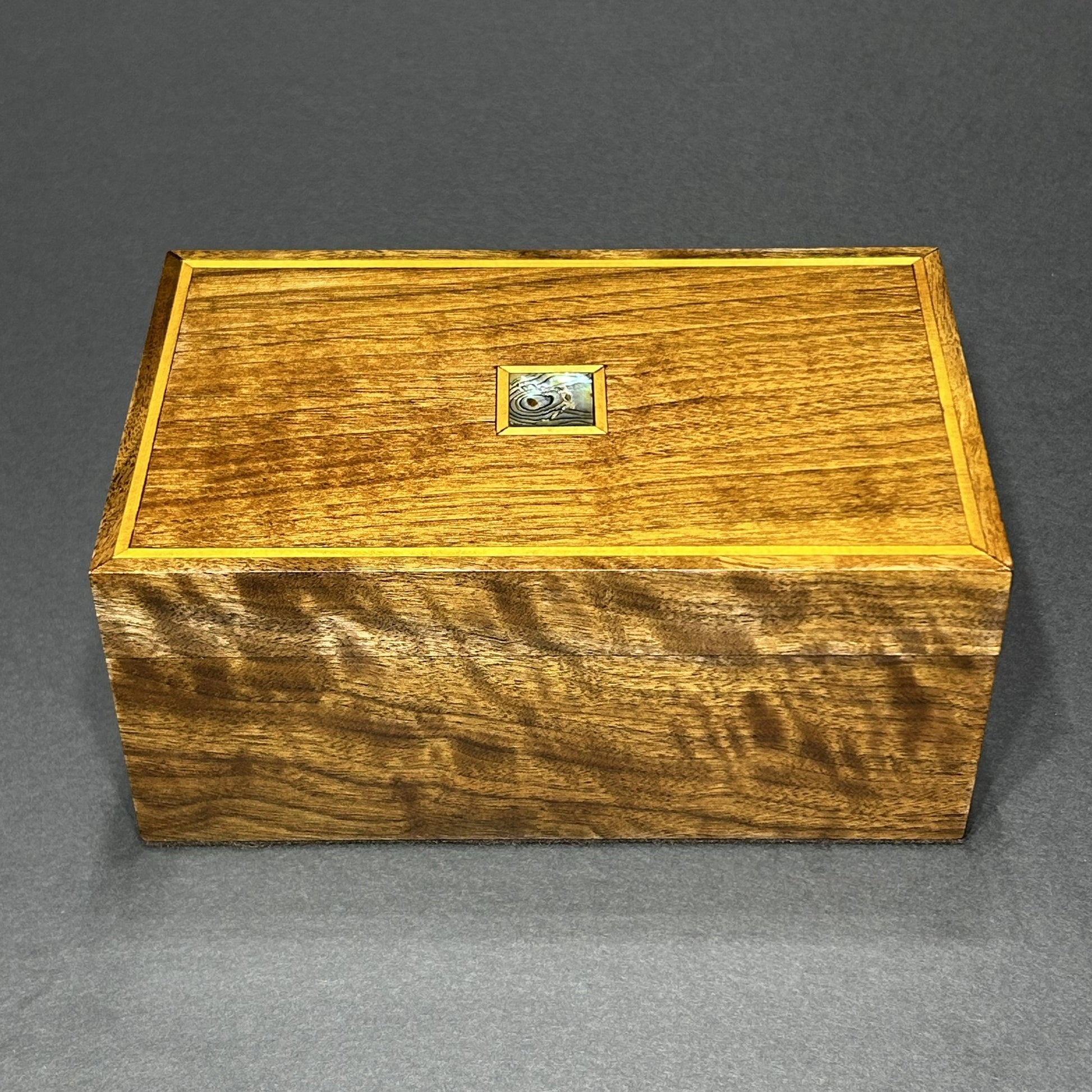 A rare form of American walnut, flamed black walnut displays rippling, flame-like patterns formed by natural stress in the tree. Prized by instrument makers, it reflects light with a rich, three-dimensional glow.